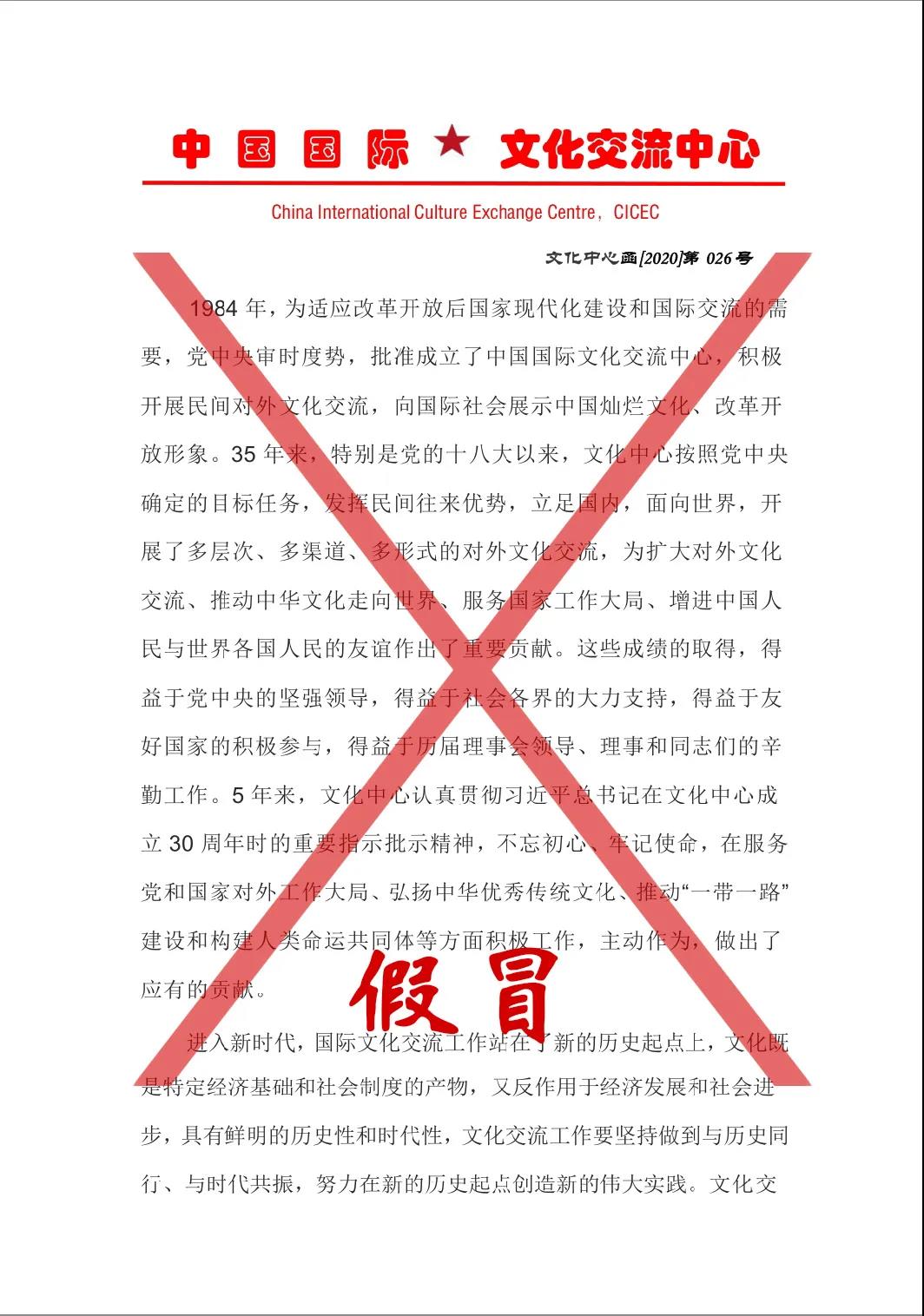 中国国际文化交流中心在此严正声明,上述活动纯属子虚乌有,是冒用中心名义,已触犯我国相关法律法规,严重侵害中心声誉和相关权力。中国国际文化交流中心特提醒有关各界,谨防上当受骗。中心将继续开展有关调查,并保留采取法律行动的权力。