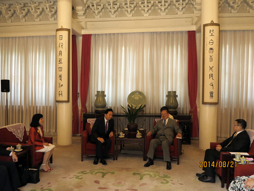 应文化中心邀请,日本前首相鸠山由纪夫及夫人一行4人于2014年8月21日至25日来华开展文化交流活动。期间,鸠山前首相一行出席了在北京外国语大学举办的“《我的人生》(中文版)新书发行暨鸠山由纪夫名誉教授授予仪式”,并赴河南省登封市出席“嵩山论坛2014年会”。